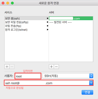 아래 사용자에 사용자명 (예를 들어 root) 을 입력하면 맨 아래 원격 주소지가 자동으로 완성된다.