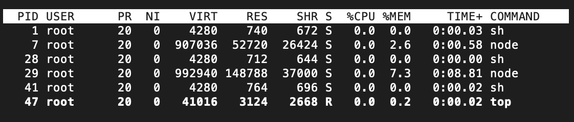 연결되면 `top` 이라고 입력해보면 node가 실행되고 있음을 확인할 수 있다.