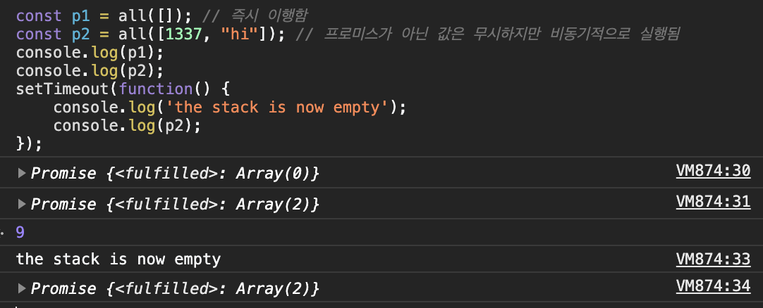 the stack is now empty 가 출력되기 전에는 Promise가 pending 상태여야 하는데 내가 만든 all 함수는 fulfilled 상태로 뱉는다.