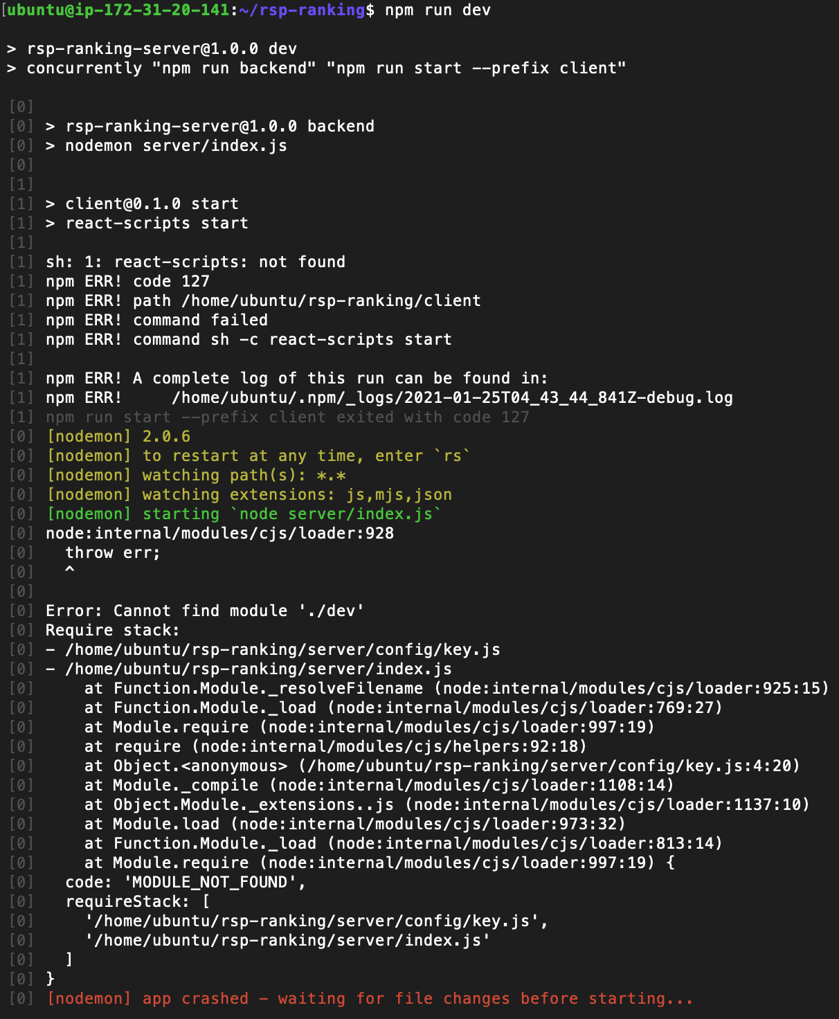 몽고 DB를 연결할 때 process.env.NODE_ENV 값에 따라서 production 모드일 땐 process.env.MONGO_URI 값을 사용하고 아니면 dev.js 파일을 사용하도록 했는데 보안을 위해 dev.js 는 git에 올리지 않았기 때문에 이러한 에러가 발생했다.
