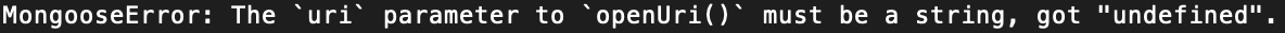 여기서 의아한 점이 NODE_ENV는 따옴표 없이 그냥 써도 잘 인식되는데 MONGO_URI는 따옴표 없이 쓰니까 다음과 같이 string이 아니고 "undefined" 를 받았다고 나온다.