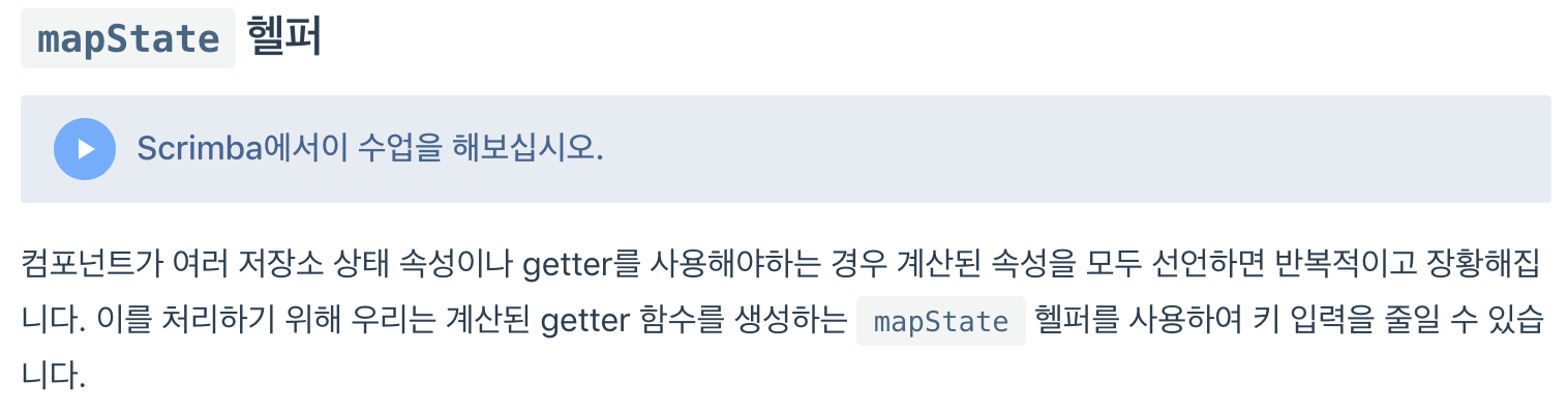 실제로 공식문서에도 그렇게 나와있다. 그러나 오늘 수강한 강의에서 캡틴판교님 말에 의하면 템플릿 부분 텍스트를 깔끔하게 하기 위해 computed를 거치는 것은 Vue.js 공식 가이드에 나와 있는 방식이라고 한다. (이 부분을 공식문서에서 아직 찾지는 못했다.) 이 때부터 혼란스럽기 시작했다. 그러면 mapState나 mapGetter는 언제 사용해야 하는걸까?